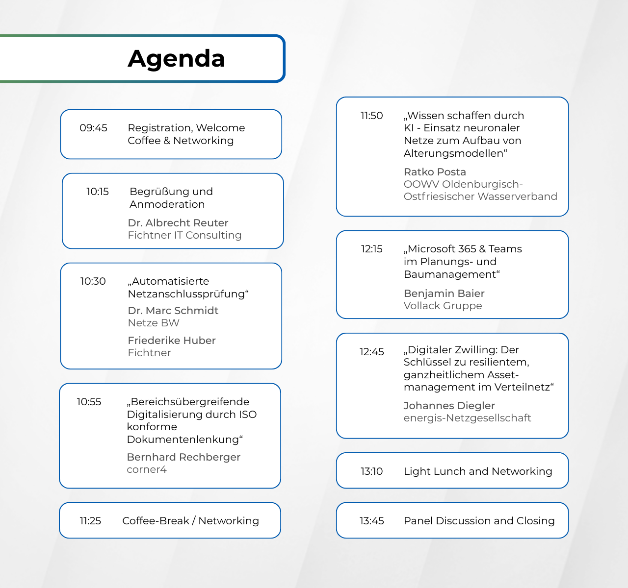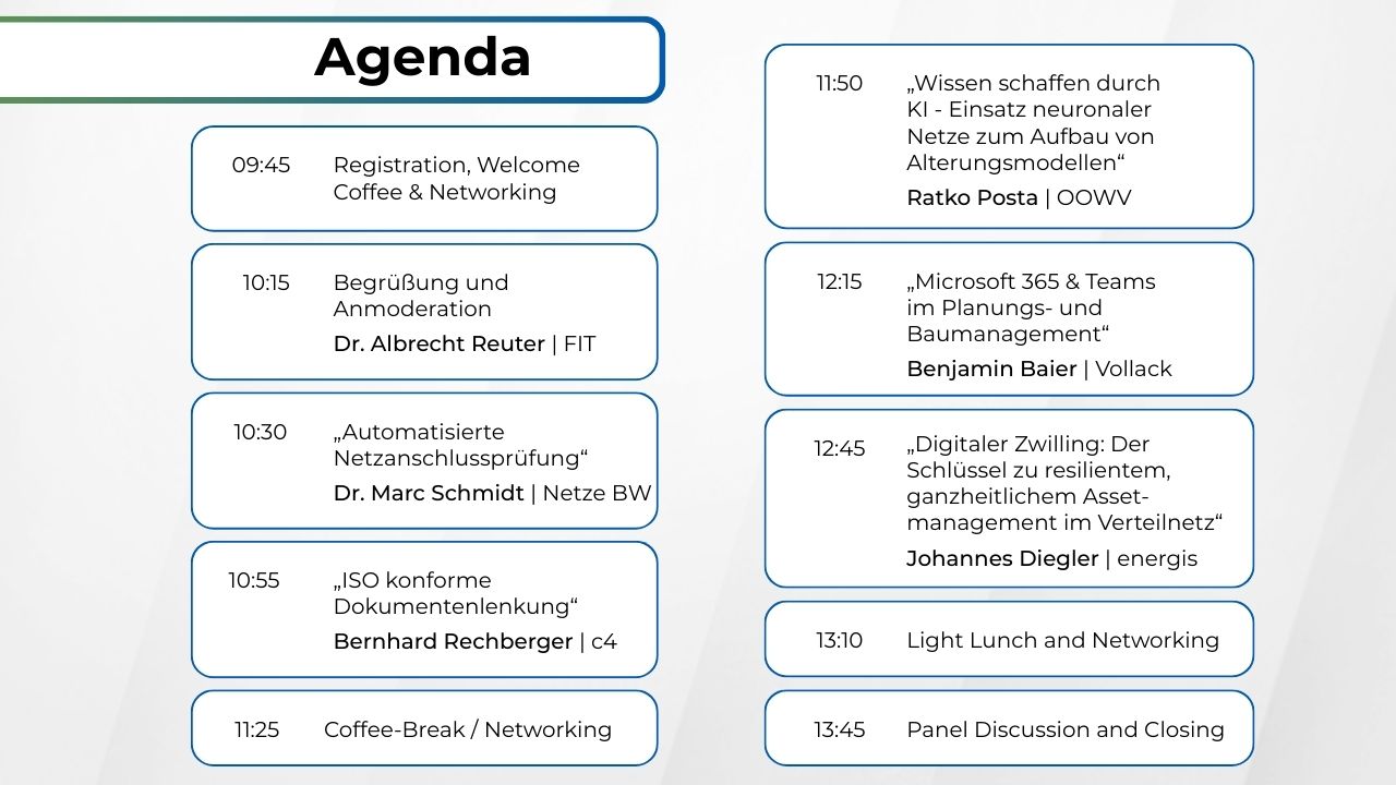 Nutzen Sie diese einmalige Gelegenheit, sich mit Experten wie Dr. Marc Schmidt von Netze BW GmbH auszutauschen, der die Prozessoptimierung mittels automatisierter Netzanschlussprüfung im Stromnetz beleuchtet. Oder diskutieren Sie mit Ratko Posta vom Oldenburgisch-Ostfriesischen Wasserverband über den Einsatz neuronaler Netze zur Erstellung von Alterungsmodellen, eine spannende Anwendung künstlicher Intelligenz. Bernhard Rechberger von corner4 Information Technology GmbH wird visionäre Ansätze zum Thema "ISO-konforme Dokumentenlenkung" vorstellen, während Benjamin Baier von der Vollack Gruppe Ihnen zeigen wird, wie Microsoft 365 & Teams Planungs- und Baumanagement vereinfachen können. Außerdem zeigt Johannes Diegler von der energis-Netzgesellschaft mbH, welche Rolle der „Digitale Zwilling“ im Verteilnetz spielen kann.